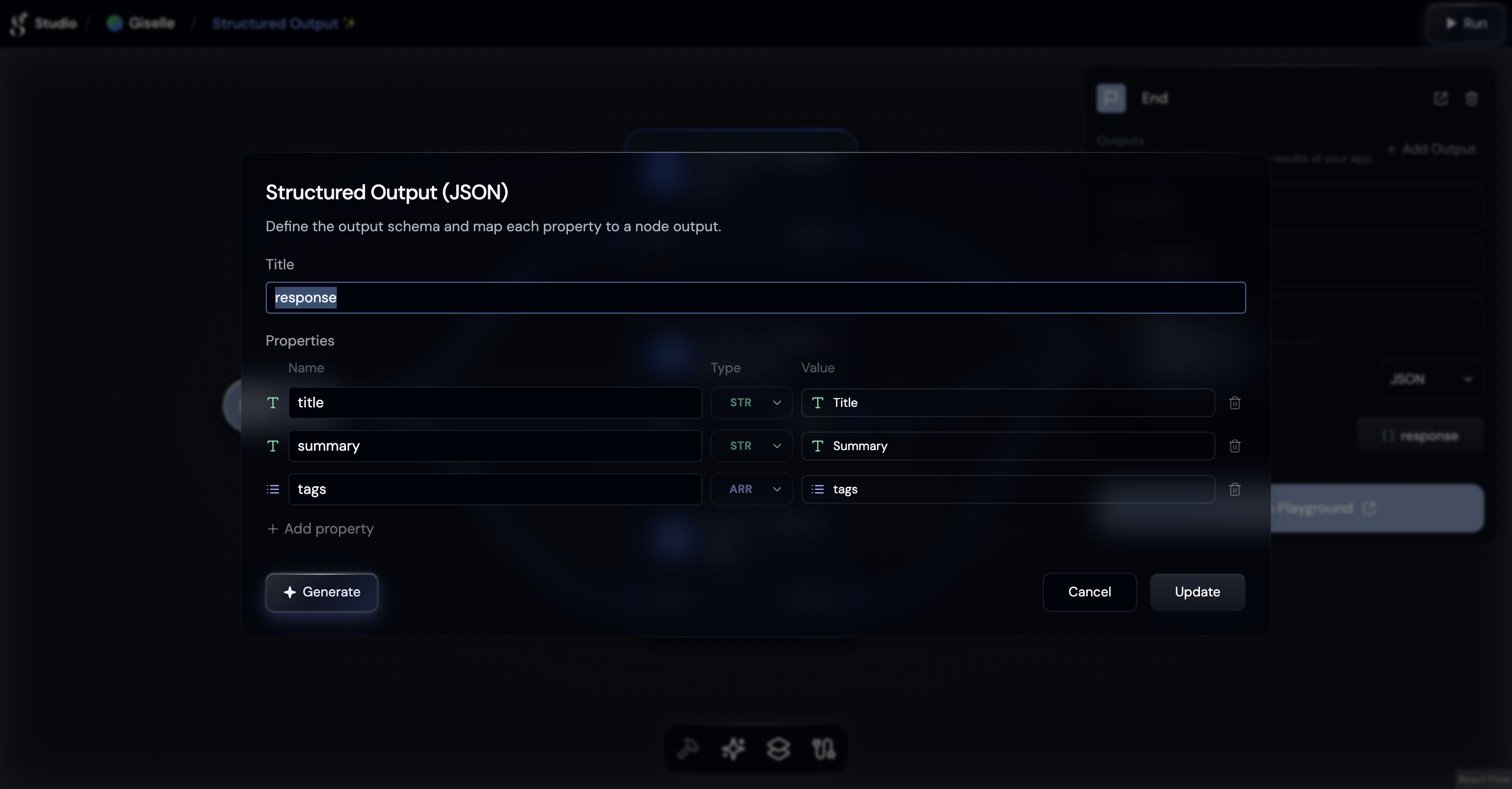 Today, we're excited to announce Structured Output — a new capability that lets you define JSON schemas for your AI-generated content directly in the Giselle workspace. With Structured Output, your Generator Nodes and End Nodes can return predictable, typed JSON instead of freeform text, making it dramatically easier to integrate Giselle into your applications and data pipelines.